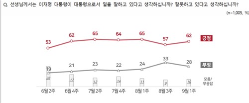 엠브레인퍼블릭·케이스탯리서치·코리아리서치·한국리서치가 지난 1일부터 3일까지 만 18세 이상 남녀 1천5명을 대상으로 진행한 전국지표조사(NBS) 결과에 따르면 이 대통령의 국정운영에 대해 긍정 평가는 62%로 나타났다.