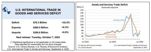 7월 무역적자 규모는 연합인포맥스의 시장 예상치(화면번호 8808) 757억달러보다도 컸다.