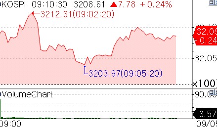 5일 연합인포맥스 신주식종합(화면번호 3536)에 따르면 오전 9시 10분 기준으로 코스피가 전 거래일보다 7.78포인트(0.24%) 상승한 3,208.61을 나타냈다.