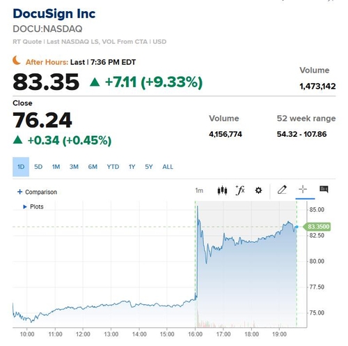 (서울=연합인포맥스) 이장원 선임기자 = 미국 디지털 문서 관리 서비스업체 도큐사인(NAS:DOCU)이 시장 예상치를 웃도는 실적과 가이던스를 발표하면서 시간외 거래에서 주가가 9% 넘게 급등했다.