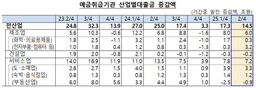 업권별로 살펴보면 예금은행은 14조3천억원 늘어, 전분기(13.8조원) 대비 증가폭이 소폭 확대됐고, 비은행예금취급기관은 2천억원 늘어 전분기(3.5조원) 대비 증가폭이 축소됐다.