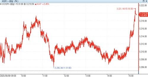이날 코스피는 0.15% 상승 출발했다. 개장한 이후 완만한 상승세로 3,210선을 돌파하면서 3,220선을 시도했다. 장 마감을 앞둔 동시호가 직전에 3,220선을 한때 넘기도 했다.