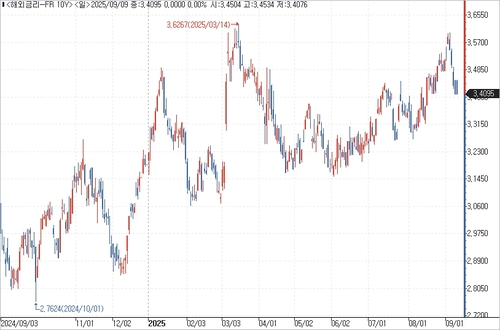 프랑스 장기국채 금리는 정부 붕괴를 선반영한 뒤 지난주 중반부터 내리막을 걸었다. 프랑스 국채 10년물 금리는 이날 3.4095%로 전장대비 2.65bp 낮아지면서 4거래일 연속 하락했다.