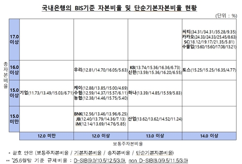보통주자본비율은 씨티·SC·카카오·수출입·토스가 14% 이상, KB·신한·하나·산업은행이 13% 이상으로 상대적으로 높았다.