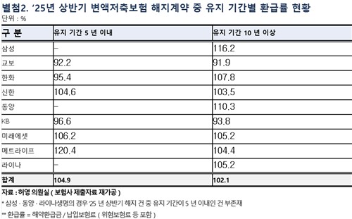 10년 이상 장기 유지 계약의 환급률은 102.1%로 사실상 원금 수준에 머물렀다. 같은 기간 누적 물가상승률 약 20%를 고려하면 실질 가치는 줄어든 셈이다. 특히 현재 판매 중인 비변액 저축보험의 예상 환급률(10년 기준 103~127%)에도 못 미쳤다.