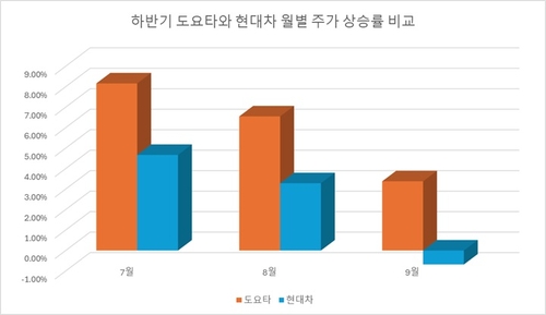 하지만, 최근 모습은 불리하다. 하반기 들어 도요타 주가가 가파른 상승세인 데 반해 온라인카지노 슬롯는 이보다 주춤했다. 이달에는 온라인카지노 슬롯가 마이너스(-)에서 아직 벗어나지 못했다.