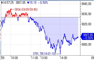 지수는 오전 장에는 상승과 하락을 거듭했으나 오후 들어 낙폭을 확대했으며, 장 중 한때 3,800선이 깨지기도 했다.