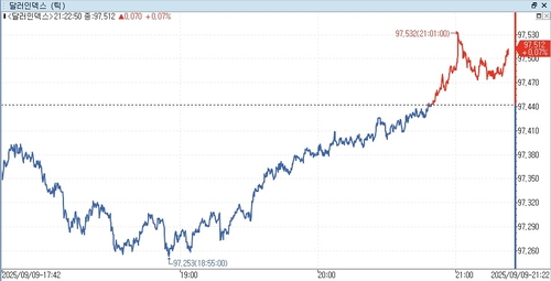 연합인포맥스(화면번호 6411)에 따르면 9일 오전 8시 20분께(이하 미 동부시간) 뉴욕 외환시장에서 주요 6개 통화에 대한 달러 가치를 반영하는 달러인덱스(DXY)는 97.486로 전장 마감 가격(97.442)보다 0.044포인트(0.045%) 소폭 올랐다.