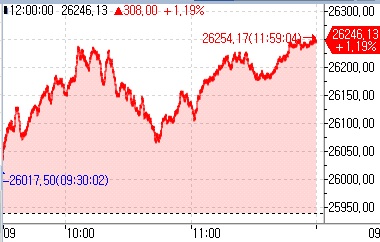 지수는 상승 개장한 뒤 장중 26,254.17까지 올랐다. 2021년 10월 이후 최고치로, 전일에 이어 이틀 연속 4년 만에 최고치까지 올랐다.