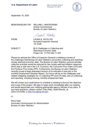 노동부 감사관실은 이날 BLS에 보낸 서신에 "노동부 감사관실은 BLS가 수집 및 보고하는 주요 경제 지표에서 직면하는 문제(challenges)에 대한 조사를 시작할 예정"이라고 적었다.
