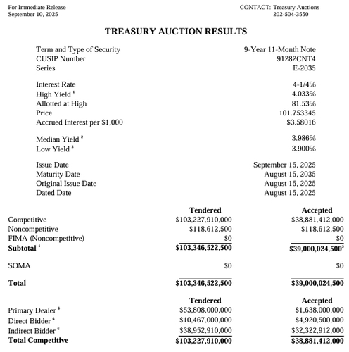 미국 재무부는 10일(현지시간) 오후 장 들어 실시한 390억달러 규모의 10년물 국채 리오픈(추가 발행) 입찰에서 발행 수익률이 4.033%로 결정됐다고 발표했다. 지난달 입찰 때의 4.255%에 비해 22.2bp 낮은 수준으로, 작년 9월 이후 최저치다.