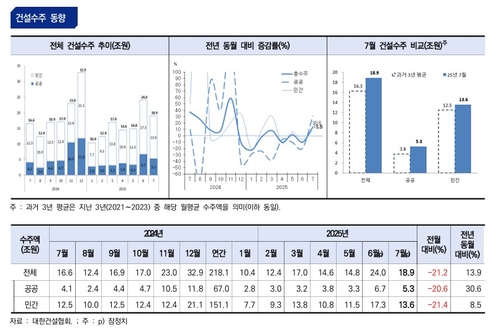 한국건설산업연구원은 '9월 월간 시장 동향'을 통해 7월 전체 건설수주는 전년 동월 대비 13.9% 증가한 18조9천억 원으로 집계됐다고 11일 밝혔다.