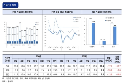 공공기성은 1조9천억 원으로 7.8% 줄었고, 민간기성도 9조5천억 원으로 14.8% 감소했다. 1~7월 누적으로는 전체 기성이 18.1% 감소해 매우 침체한 모습이다.