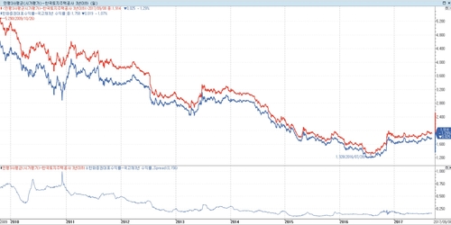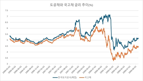 11일 연합인포맥스 발행사별 채권 시가평가(화면번호 4763)에 따르면 지난 2008년 12월, 지금은 LH로 통합된 한국토지공사가 발행한 채권(토공채) 3년물의 민평금리와 같은 만기 국고채의 스프레드(금리차)는 270bp를 오르내렸다. 그해 8월부터 두 채권 금리의 방향이 엇갈리더니 연말까지 스프레드가 벌어졌다. 토공채 금리는 7%를 웃돌았다.