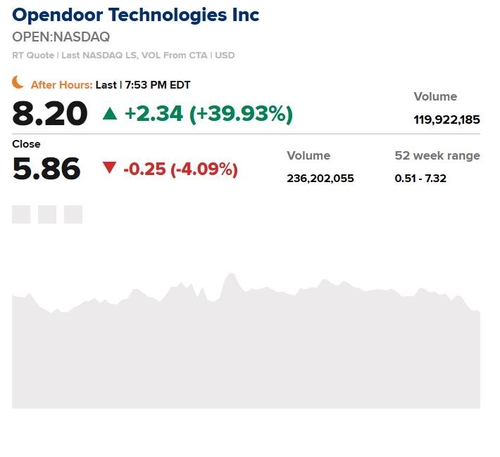 CNBC에 따르면, 오픈도어는 지난 6월 사상 최저치를 기록한 이후 현재까지 주가가 15배 이상 상승했다.