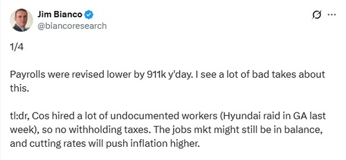 월가 베테랑인 비앙코 리서치의 짐 비앙코 대표는 10일(현지시간) 자신의 소셜미디어 엑스(엣 트위터) 계정에 "불법체류자들을 대거 고용했기 때문에 원천징수 세금이 발생하지 않았다"며 이같이 말했다.