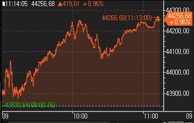 오전 11시 13분 현재 대형 수출주 중심의 닛케이 지수는 전일 대비 428.93포인트(0.98%) 상승한 44,266.60에 거래돼 이전 최고치를 넘어섰다.