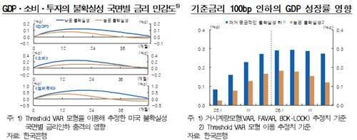 한은은 통상 불확실성이 높은 시기에는 경제주체들이 소비와 투자를 미루면서 금리 민감도가 저하되는 경향이 있다고 설명했다.