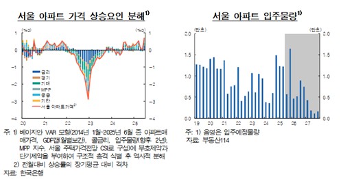 한은의 모형 분석 결과 올해 상반기 중 서울 아파트 가격 상승분의 26% 정도가 금리 요인에 기인하고, 나머지 74%는 수급, 규제, 심리 등 여타 요인에 의한 것으로 추정됐다.