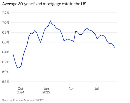 미국 모기지은행협회에 따르면 30년 고정금리 주택담보대출 금리가 지난주에 약 1년 만의 최저 수준으로 떨어져 약 6.49%를 나타냈다.