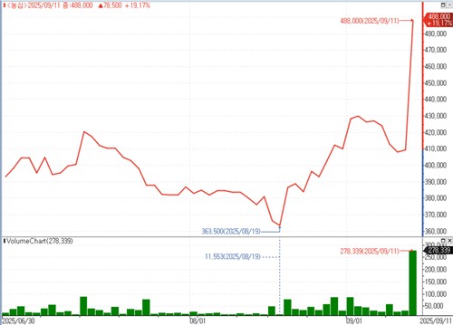 12일 연합인포맥스 현재가(화면번호 3111) 화면에 따르면 지난 11일 농심 주가는 전날 대비 19.17% 치솟은 48만8천 원으로 장을 마쳤다. 이날 52주 신고가를 경신했으며, 지난해 6월 기록한 역대 최고가(59만9천원)에도 한발 다가섰다.