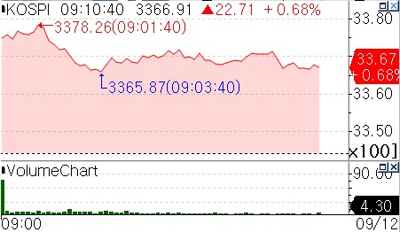 12일 연합인포맥스 신주식종합(화면번호 3536)에 따르면 오전 9시 10분 현재 코스피는 전 거래일보다 22.71포인트(0.68%) 오른 3,366.91을 기록했다. 코스피는 지난 10일 4년여 만에 사상 최고치를 기록했고, 11일에도 사상 최고로 마감했다.