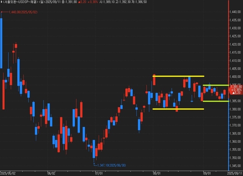 지난 8월 대비로 상하단은 한층 더 좁아졌다. 지난달에는 1,380원에서 1,400원까지 20원 정도 상대적으로 넓은 구간에서 움직였다.