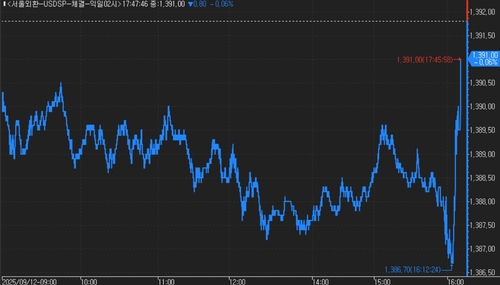 12일 서울 외환시장에서 달러-원 환율은 오후 5시46분 현재 전일대비 0.80원 내린 1,391.00원에 거래됐다.