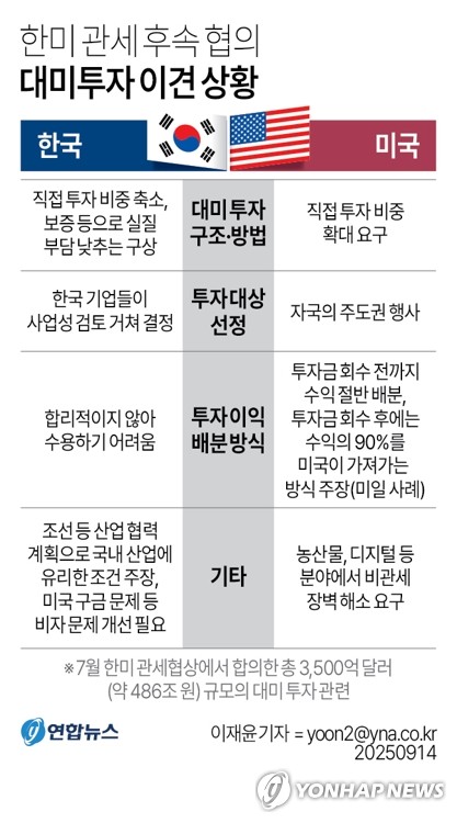 하지만 구체적인 대미 투자의 구조, 방법, 이익 배분 방식 등 세부 내용 등을 요전히 합의점을 찾지 못하고 있다.