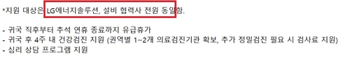 건강검진과 심리 상담 프로그램도 똑같이 지원한다. LG에너지솔루션은 권역별로 1~2개 의료검진 기관을 확보해뒀고, 추가 정밀검진 필요시 검사료를 지원할 예정이다.