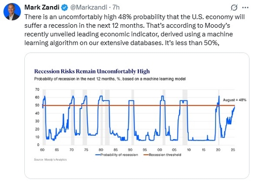 무디스의 마크 잔디 수석 이코노미스트는 14일(현지시간) 소셜미디어 엑스(옛 트위터)에 "무디스가 머신러닝(기계학습) 알고리즘을 사용해 새롭게 개발한 경기 선행 지수를 보면, 미국이 향후 12개월 내 경기 침체를 겪을 확률은 48%로 추산된다"고 밝혔다.
