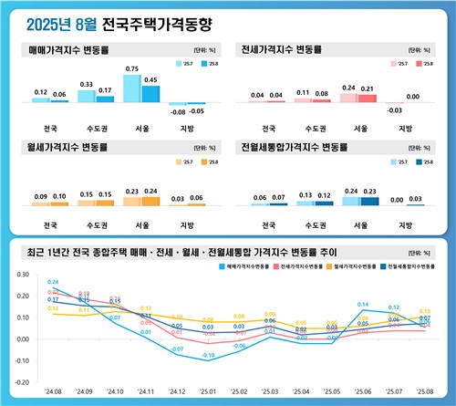 한국부동산원이 15일 발표한 '2025년 8월 전국주택가격동향조사'에 따르면, 전국 주택종합 매매가격은 0.06% 상승하며 전월(0.12%) 대비 절반 수준으로 상승폭이 작아졌다.