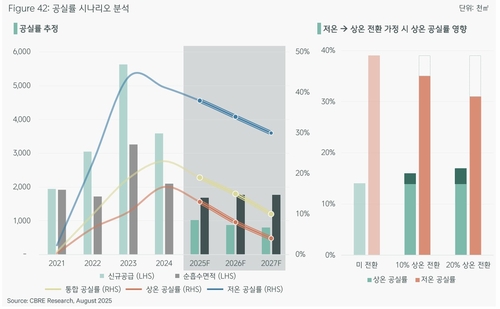 지난해 20%를 웃돌던 통합 공실률은 올해 들어 하향세로 돌아섰으며, 2027년에는 10% 수준까지 떨어질 것으로 전망됐다.