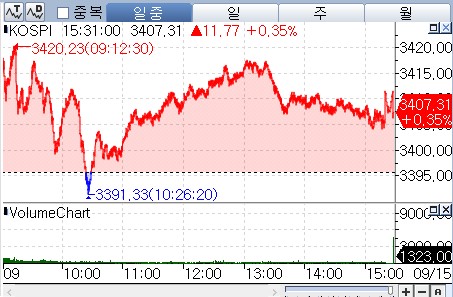 15일 연합인포맥스 신주식종합(화면번호 3536)에 따르면 코스피는 전 거래일보다 11.77포인트(0.35%) 오른 3,407.31에서 거래르 마쳤다.