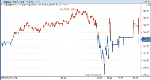15일 외환시장에서 달러-원 환율은 오후 9시 11분 현재 전 거래일 대비 0.20원 상승한 1,388.10원에 거래됐다.