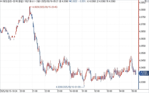 연합인포맥스의 해외금리 일중 화면(화면번호 6532)에 따르면 15일(미국 동부시간) 오후 3시 현재 뉴욕 채권시장에서 10년물 국채금리는 직전 거래일 오후 3시 기준가 대비 2.60bp 내린 4.0340%에 거래됐다.