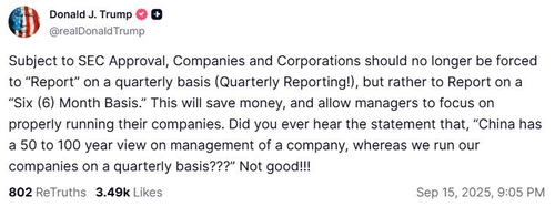 트럼프는 15일(현지시간) 자신의 소셜미디어 트루스소셜에 "증권거래위원회(SEC) 승인 대상이긴 하지만 기업들과 회사들은 더 이상 분기별로 (실적을) 보고하도록 강제돼선 안 된다"며 "대신 6개월 단위로 보고하도록 해야 한다"고 주장했다.