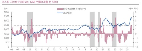 그는 "반면 현재는 실적 전망의 하향 압력이 우위에 있으나 과거 사례들만큼 그 강도가 강하지 않다"며 "결국 실적 변동에 기인한 부분보다는 정부의 정책 드라이브에 힘입은 코리아 디스카운트 해소에 대한 기대감이 증시에 반영되고 있다"라고 평가했다.