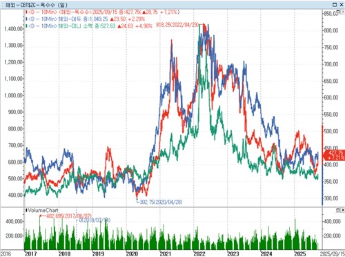 황병진 NH투자증권 연구원은 "곡물 중심의 농산물 공급 차질을 초래할 수 있는 기후 변수가 내년 상반기까지는 부재하다"며 "미국 옥수수와 대두(콩) 작황은 예년 수준을 상회, 9월 이후 수확기 동안 생산 전망치에서의 상향 조정 가능성을 예고한다"라고도 덧붙였다.