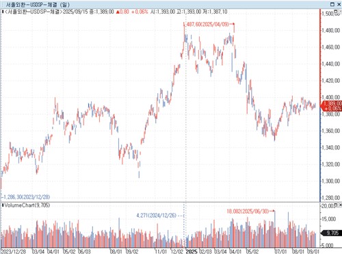 연합인포맥스 달러-원 거래 종합(화면번호 2110) 화면에 따르면 달러-원 환율 종가는 전날 기준 1,389.00원이다. 작년 12·3 비상계엄 등 여파로 올랐던 연초 환율 수준보다는 낮지만, 전년 같은 달 대비 50~60원가량이 높다.