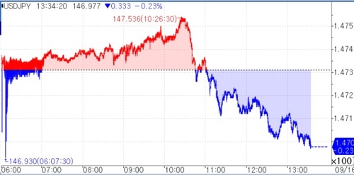 (서울=연합인포맥스) 김지연 기자 = 16일 달러-엔 환율은 9월 연방공개시장위원회(FOMC)를 앞두고 연방준비제도(연준·Fed) 금리 인하 기대감에 하락하며 147엔 밑으로 내려갔다.