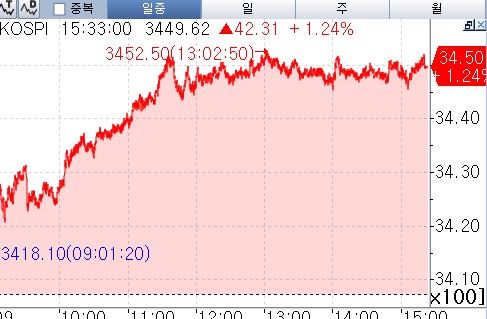 코스피는 오전 장 시작부터 꾸준히 오름세를 나타냈다. 오후 1시 2분에는 역대 최고치인 3,452.5를 터치하며 3,450선을 돌파하기도 했다.