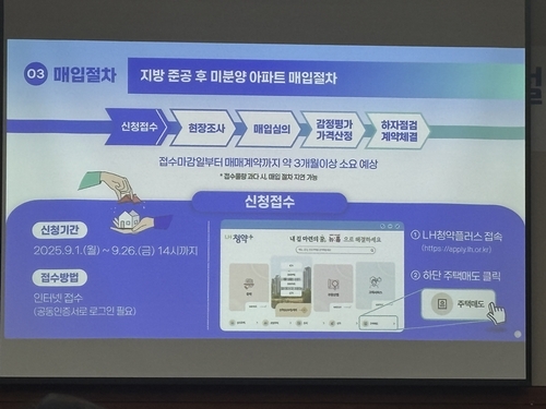 (성남=연합인포맥스) 윤영숙 기자 = 한국토지주택공사(LH)가 지방권 미분양 주택 매입을 본격화한 가운데, 2차 매입 설명회에 미분양주택을 털어내려는 건설사, 시행사, 금융권 관계자들의 관심이 집중됐다.