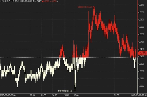 연합인포맥스의 해외금리 일중 화면(화면번호 6532)에 따르면 16일(미국 동부시간) 오전 9시 현재 뉴욕 채권시장에서 10년물 국채금리는 전 거래일 오후 3시 기준가보다 2.20bp 오른 4.056%를 기록했다.