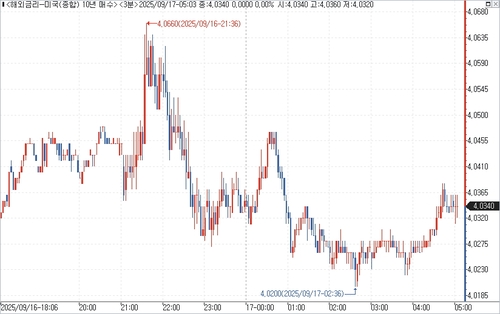 연합인포맥스의 해외금리 일중 화면(화면번호 6532)에 따르면 16일(미국 동부시간) 오후 3시 현재 뉴욕 채권시장에서 10년물 국채금리는 전 거래일 오후 3시 기준가 대비 0.80bp 내린 4.0260%에 거래됐다.