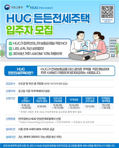 국토부는 주택도시보증공사(HUG) 든든전세주택을 4분기까지 두 차례에 걸쳐 총 1천400호 공급한다고 17일 밝혔다.