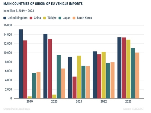 전기차 등 친환경차 수요는 유럽이 선도하는 상태다. 이를 잘 파고들어 한국은 EU가 자동차를 수입하는 국가 중 유일하게 매년 성장세다. 현대차[005380]·기아[000270]가 끌고 최근에는 KG모빌리티[003620]까지 가세했다. 경쟁국과의 격차도 많이 좁혔다. 터키의 그래프 모양도 우상향이지만, 다국적 브랜드들의 생산기지 역할만 하는 특수성이 있다.