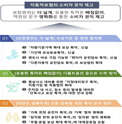 일부 불합리한 특약을 손보고, 필요한 특약은 자동 가입을 기본값으로 운영하는 등 현행 자동차보험 특약을 개선한 것이다.