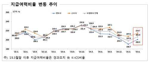생명보험사와 손해보험사가 200.9%와 214.7%로 전 분기 말보다 각각 10.2%p와 7.0%p 올랐다. 킥스비율은 가용자본을 요구자본으로 나눈 값이다.
