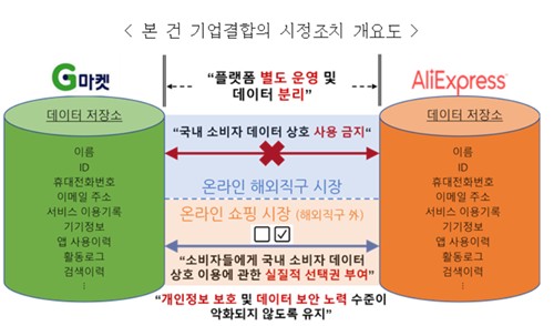 이에 공정위는 지마켓 및 옥션과 알리익스프레스를 상호 독립적으로 운영하고, 이들 회사 간 국내 소비자 데이터를 기술적으로 분리하도록 했다.